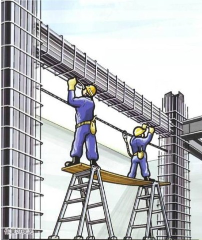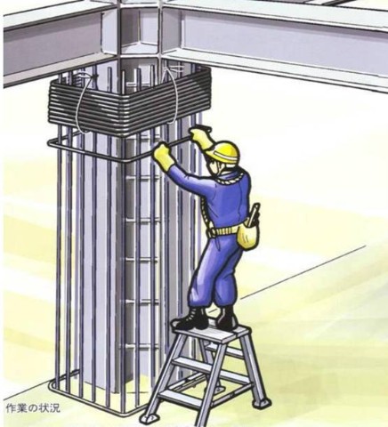 正在人字梯上进行箍筋作业。