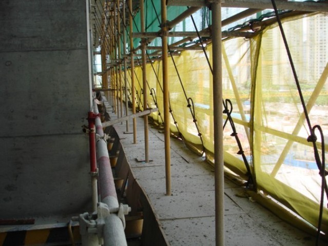 脚手架的第一道平桥(以后每隔10m),平桥与建筑物之间应完全密封。