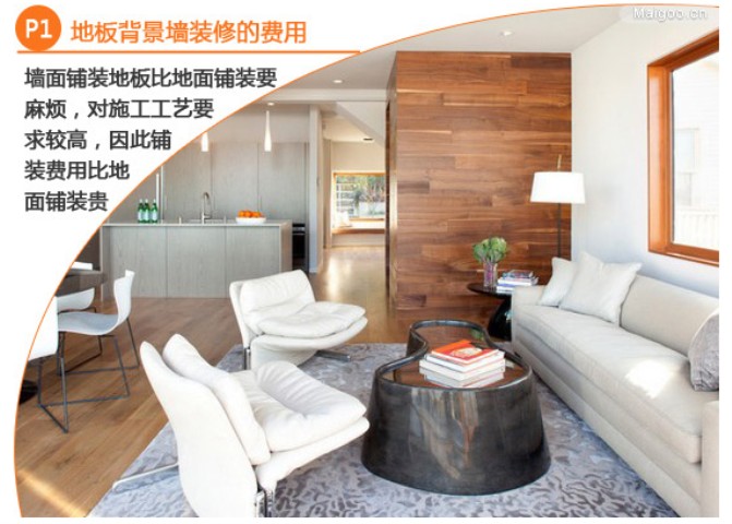 墙面铺木地板与地面铺木地板,即使质料一样,由于墙面铺装比地面铺装要麻烦,对施工师傅的工艺手法要求较高,因此地板上墙的铺装用度比地面铺装要贵。不过,也由于只是小范畴使用,总体用度不致于太高。