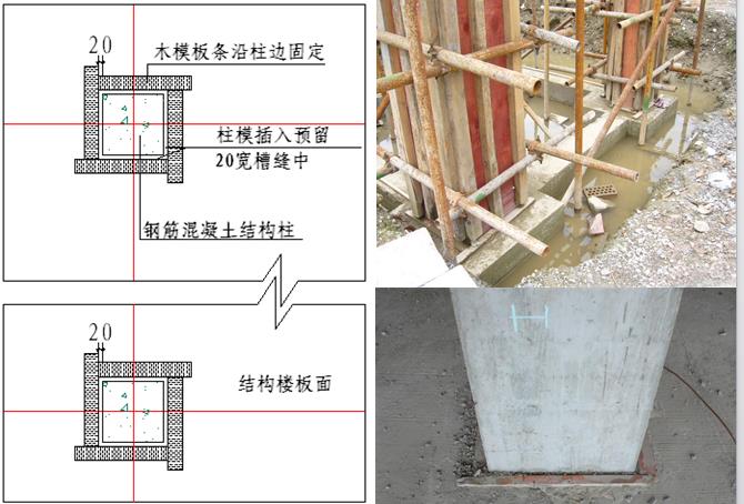 首先要保证模板支设质量,控制好梁柱截面、楼板厚度,标高和轴线位置必须准确; 其次做好模板防漏浆措施,比如柱和剪力墙根部加钉模板的效果就比较好,如图1; 再次钢筋保护层垫块应按规范设置,且保护层垫块应有足够的强度保证钢筋位置的相对准确; 关键是在混凝土浇筑时控制好坍落度、混凝土自由下落高度,加强振捣防止漏振和超振,在浇筑完成混凝土的坍落度达到3-5cm时进行二次振捣(特别是上翻梁等部位),楼板在二次振捣后用机械磨平; 最后覆盖薄膜养护防止楼板开裂,柱拆模后及时浇水覆膜养护,剪力墙拆模时间应稍推后并保证模板湿润已达到养护的目的。 混凝土养护必须保持混凝土表面湿润,养护时间应不少于7天,有外加剂的混凝土养护时间不少于14天。