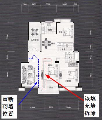 小区是框剪结构一共12层,我想改下户型,把原来的填充墙(红色虚线)打掉,腾出来做大厅,在左边(蓝色虚线)砌墙砌出一个卧室来。