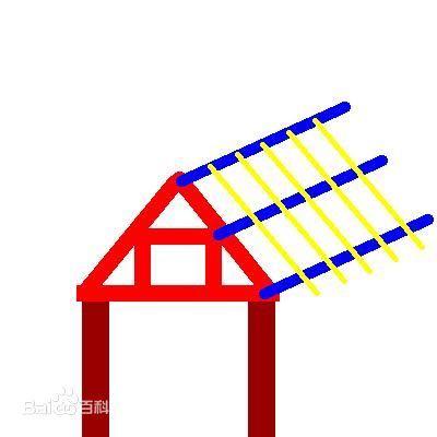 图中红色的是梁架,蓝色的叫檩条,黄色的就是椽子,椽子細而密,组成了屋面的主体,瓦片是架在椽子上的。一般屋顶没图里那么峻峭,实际中的屋子多数没有那么峻峭,屋顶只有15度左右的倾斜。