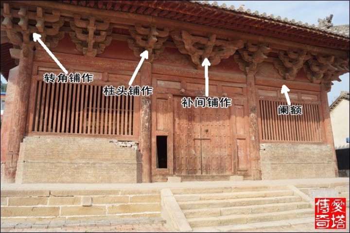 阑额是柱头间的联系构件,安置于柱头,上皮与柱齐平,有些建筑柱子最下端也有一道这样的联系构件,称为“地栿”。普拍方安置于柱头阑额之上,压于栌枓之下。普拍方与阑额的断面呈“T”字形。早期建筑一般不消普拍方,现存十几座唐和五代建筑中只有平顺大云院弥陀殿使用了普拍方,宋以后开始应用广泛。(山西沁县大云院正殿)