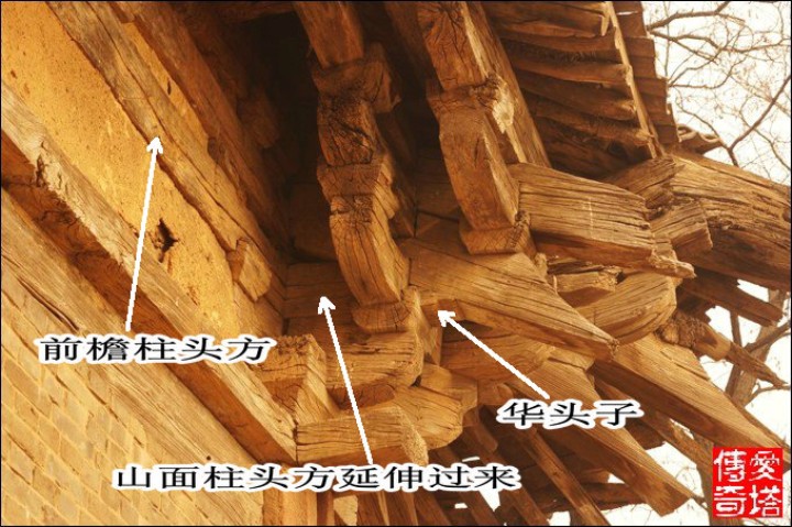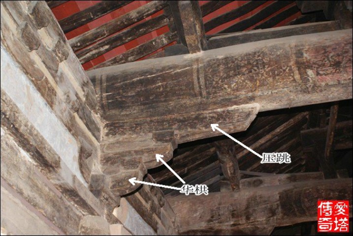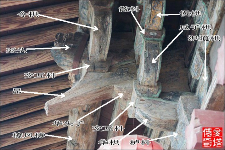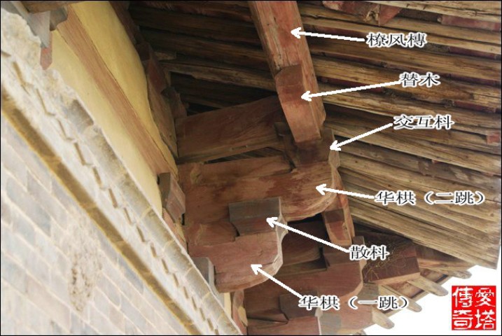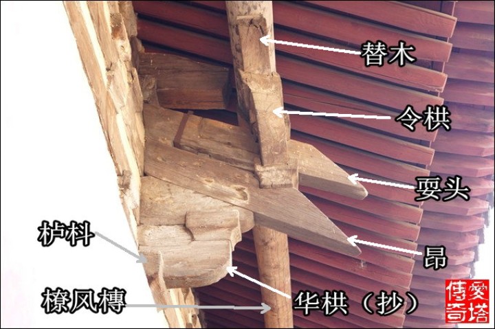 再做张假昂与耍头区分的图。假昂和真昂一样也出跳,区别是真昂是斜置构件,用杠杆原理挑出,而假昂是水平构件,只把昂尖做成昂形,作用与华栱相当。假昂与耍头的区分同样是看是否出跳,此图下面出跳托令栱的是昂(假昂),上面不出跳的是耍头。(山西平顺北社玉皇庙)