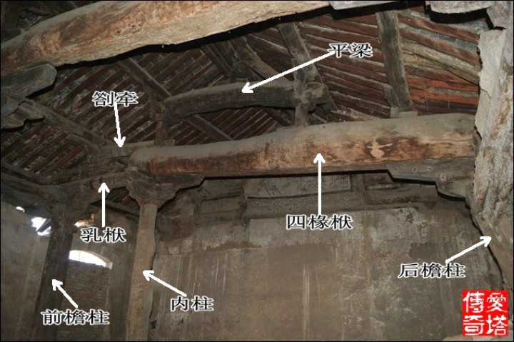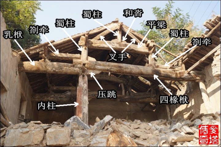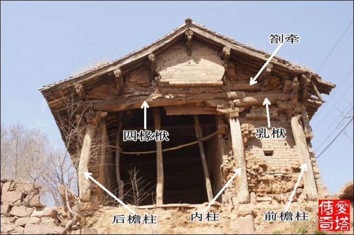 山西长治市级文物守卫单位壶关县清流老君庙元代正殿的东山墙在2013年雨季坍塌了,梁架外露,六椽屋四椽栿对乳栿用三柱是晋东南地区早期大木作最多见的梁架结构形式,这张图标出了主要构件的名称。