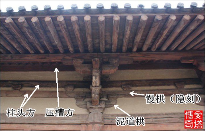 隐刻是古建筑中的一种常用手法,这张图中的建筑没有使用独立的慢栱,而是在柱头方上刻出了慢栱的形状,两端仍然使用了散枓,这种不使用单独构件而是在其他构件上刻出局部形状的做法称为“隐刻”(山西五台南禅寺大殿)