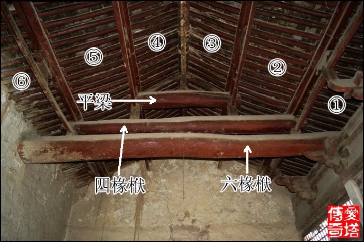 古建筑的梁架结构有多种组合,这也是一座六椽檐栿通搭的建筑,结构与上图有很大差别,六椽栿上用四椽栿,四椽栿上用平梁(两椽),逐层递减,形成中国式衡宇的山尖