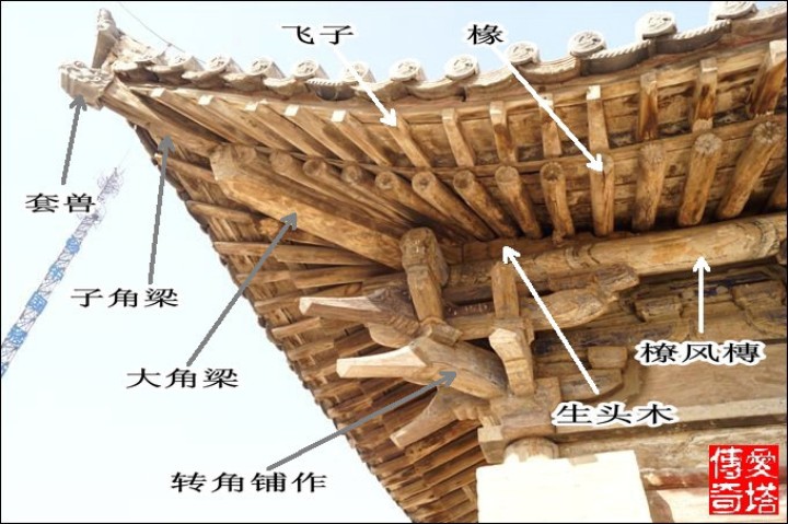 铺作最外跳上承托的槫称为橑风槫,也是整个屋架结构中最下面的槫,这一位置也有不消槫而用方的,称为橑檐方。山西绝大多数早期大木作使用橑风槫,我只见过几处应用橑檐方的实例