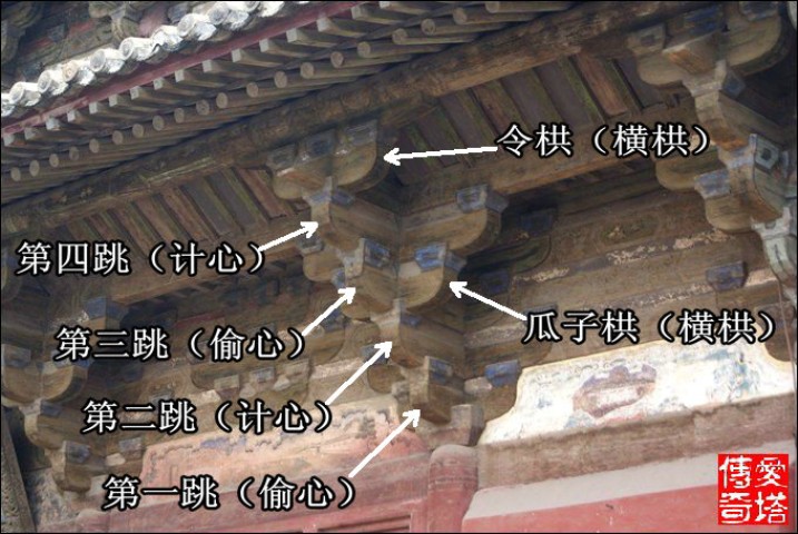 华栱或昂向前挑出一段称为“跳”,这张照片中下面的华栱和昂各向前挑出一段,各出一跳,这朵枓栱一共出两跳。耍头不向前挑出为不出跳