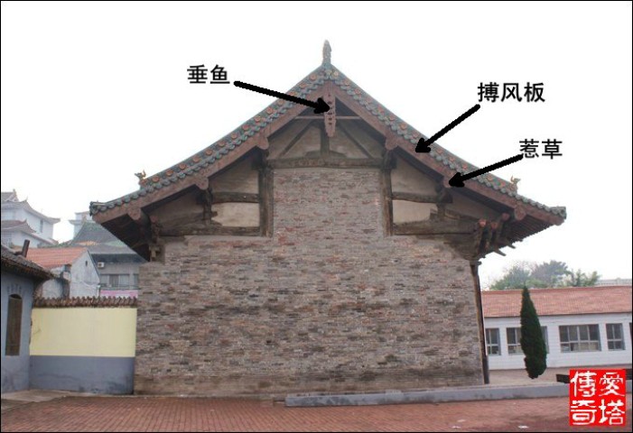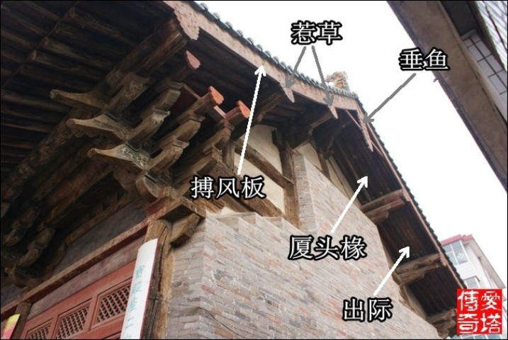 悬山顶和九脊顶两山伸出的局部称为“出际”,安置于出际处的椽子称为“厦头椽”因为九脊顶又称“厦两头造”,而悬山顶没有两山出檐,又称“不厦两头造”。搏风板安置于山面出际处以挡风雨,垂鱼惹草即守卫槫头又能起装饰作用