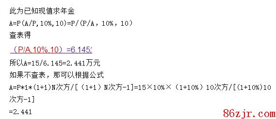 某人购买一套住宅,一次性付款15万元,若该住宅使用年限还有10年,资本利率为10%,则每年平均住房用度为几多万元?