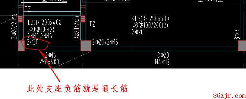 梁集中标注处写上通长筋为2c20,但是图左的原位标注又为2c20,该处有端支座负筋,是通长筋在支座处直接通过替代了负筋。