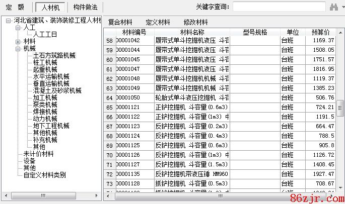 在人材机查找种种机械的用度,挖掘机的如图,其他同理。