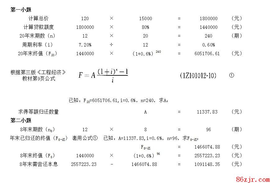 贷款总额180万元,贷款是总款的80%,也就是144万元,则某家庭购买一套120m2住房,单价15000元/m2。银行抵押贷款80%,贷款年利率为7.2%,期限为20年,若按月等额偿还,问月还款额为11337.83元。