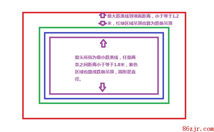 ,按龙骨跌级高差外边线所含最大矩形面积以平方米计算,套二三级顶棚龙骨。 其中龙骨跌级高差外边线是指出现高差至墙的最大矩形吗?2、若最大跌落线向外、距墙边小于即是1.2米时,最大跌落线以外全部吊顶,为三三级吊顶顶棚,若最小跌落线任意两对边之间的距离或直径小于即是1.8米时,最小跌落线以内的全部吊顶为二三级吊顶顶棚。其中最小跌落线任意两对边之间的距离或直径小于即是1.8米时怎么理解,我是初学者,请前辈针对你的理解给我讲解一下,谢谢