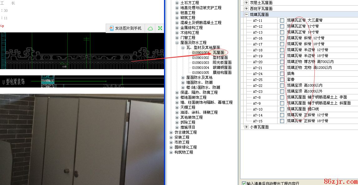 图一的灰塑屋脊,图二的U型包梁装饰,分别怎么套价,还有茅厕的那种断绝要怎么套