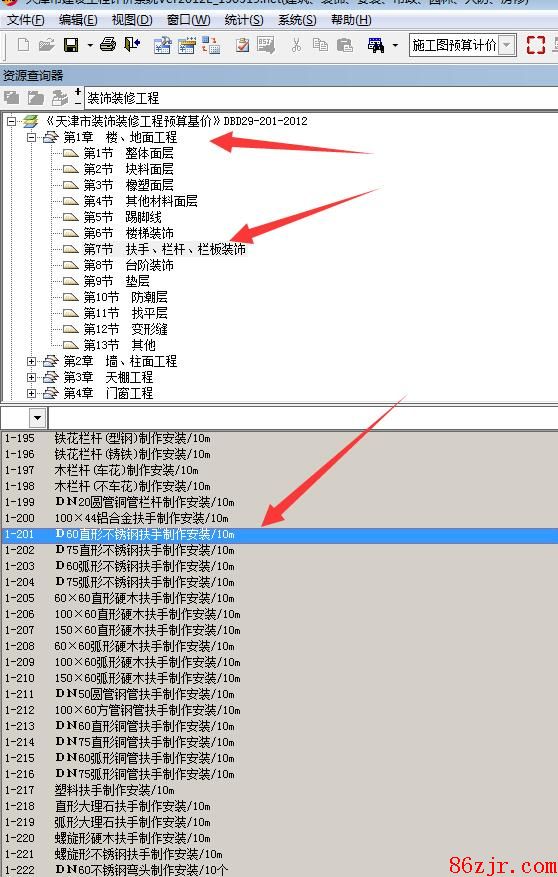 拉丝不锈钢扶手应该选择套取2012年天津市装饰定额中的1-201~1-204 定额子目。