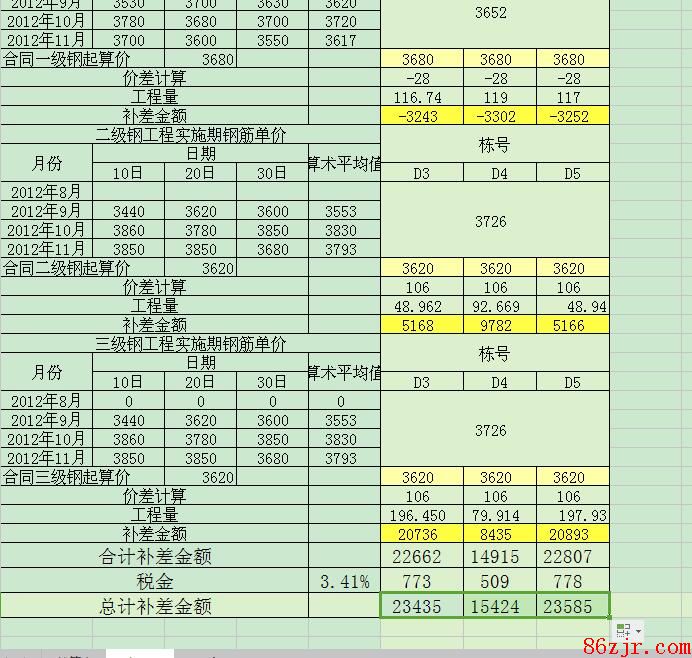 他这个就是和钢筋调差一个原理的,就是说因为质料有转变,综合单价不调解,只是调解质料的价格并计取税金,质料变动调差的不要在软件中处理了,单独做一个表格就可以了,如下图的钢筋调差表格