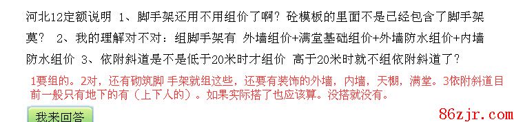 说明1、脚手架还用不消组价了啊?砼模板的里面不是已经包括了脚手架莫?2、我的理解对过错:组脚手架有 外墙组价+满堂基础组价+外墙防水组价+内墙防水组价3、依附斜道是不是低于20米时才组价 高于20米时就不组依附斜道了?