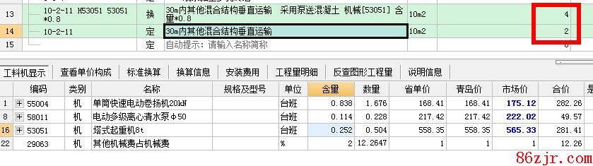 ——:您的意思就是说,四层以下用的是泵送,然后五、六层是用塔吊的,对吧?,那您分您的楼层面积就可以的,您一二三四层的笔直运输费您就用换算的系数,您五六层的笔直运输费不换算系数