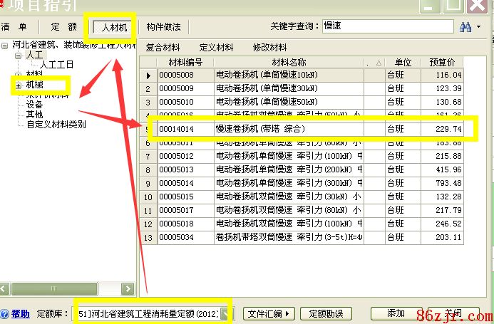 这个不消查单价的啊,定额上是有的啊,就在定额机械费里选这个就行了,在人材机里盘问就行了,下图是奔驰软件在人材机里盘问的,你用广联达计价软件也可以在条件盘问里找,只不过在人材机里找就行了。