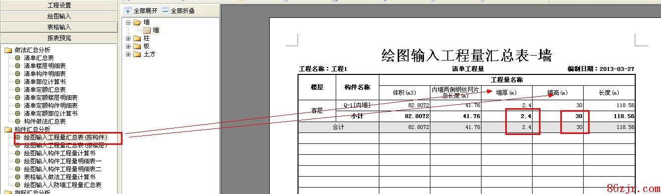 报表中的墙厚墙高统计的是总量,好比有一个厚度为200mm的墙体,绘制了20道,那么厚度计算的就是0.2*20=4m。